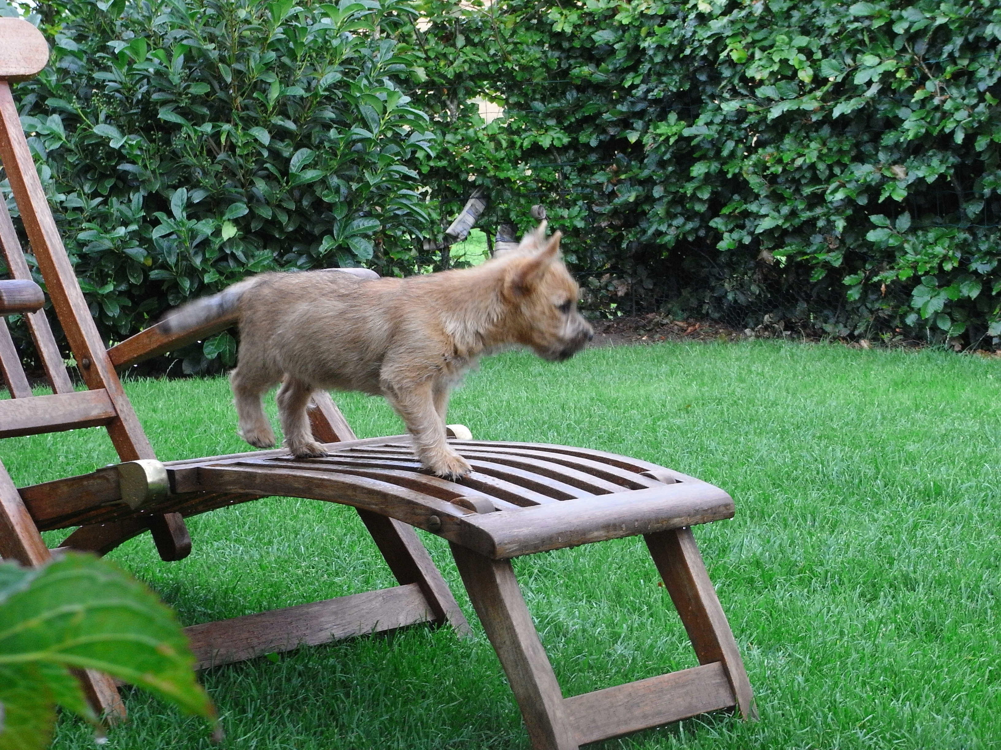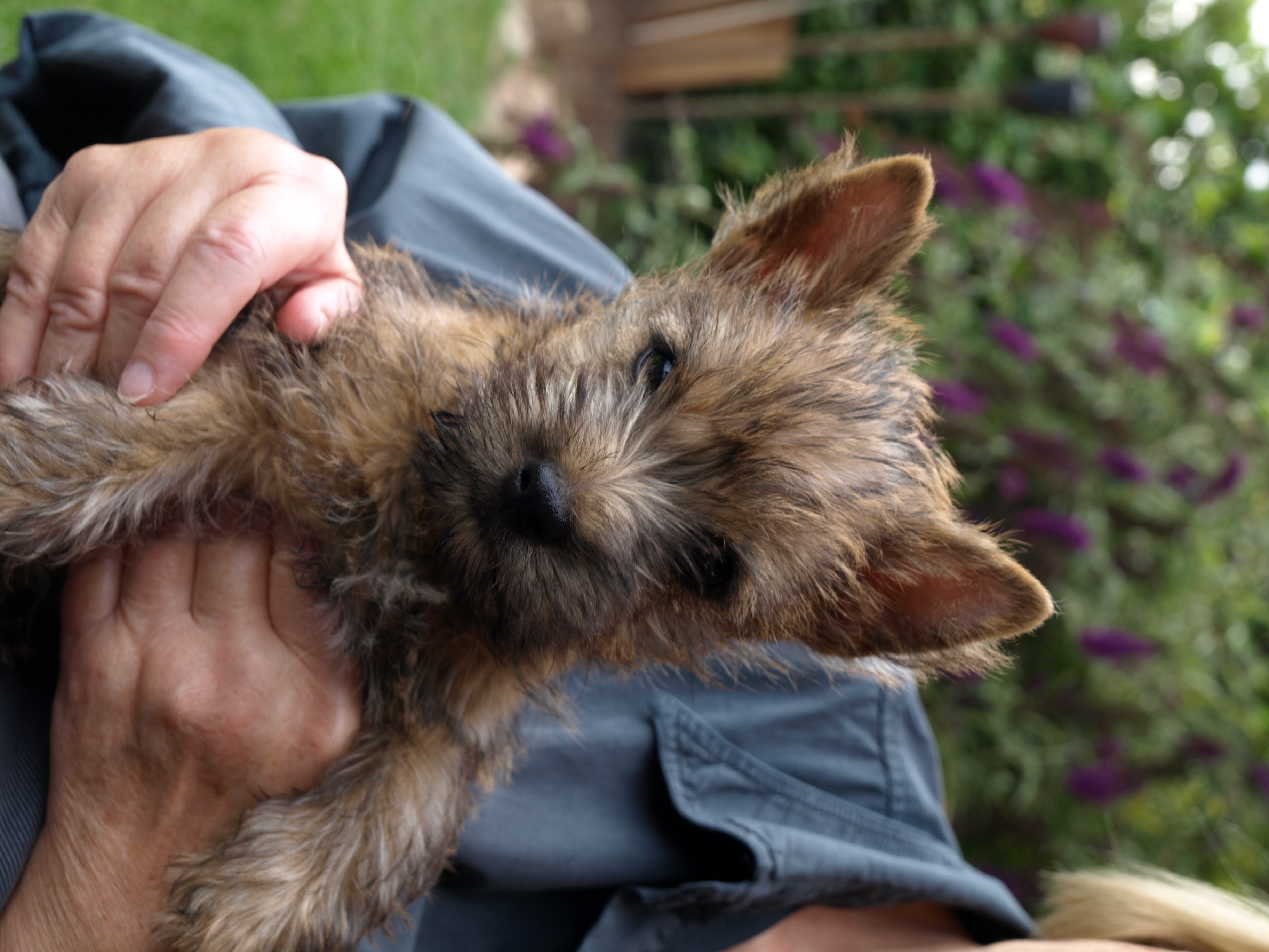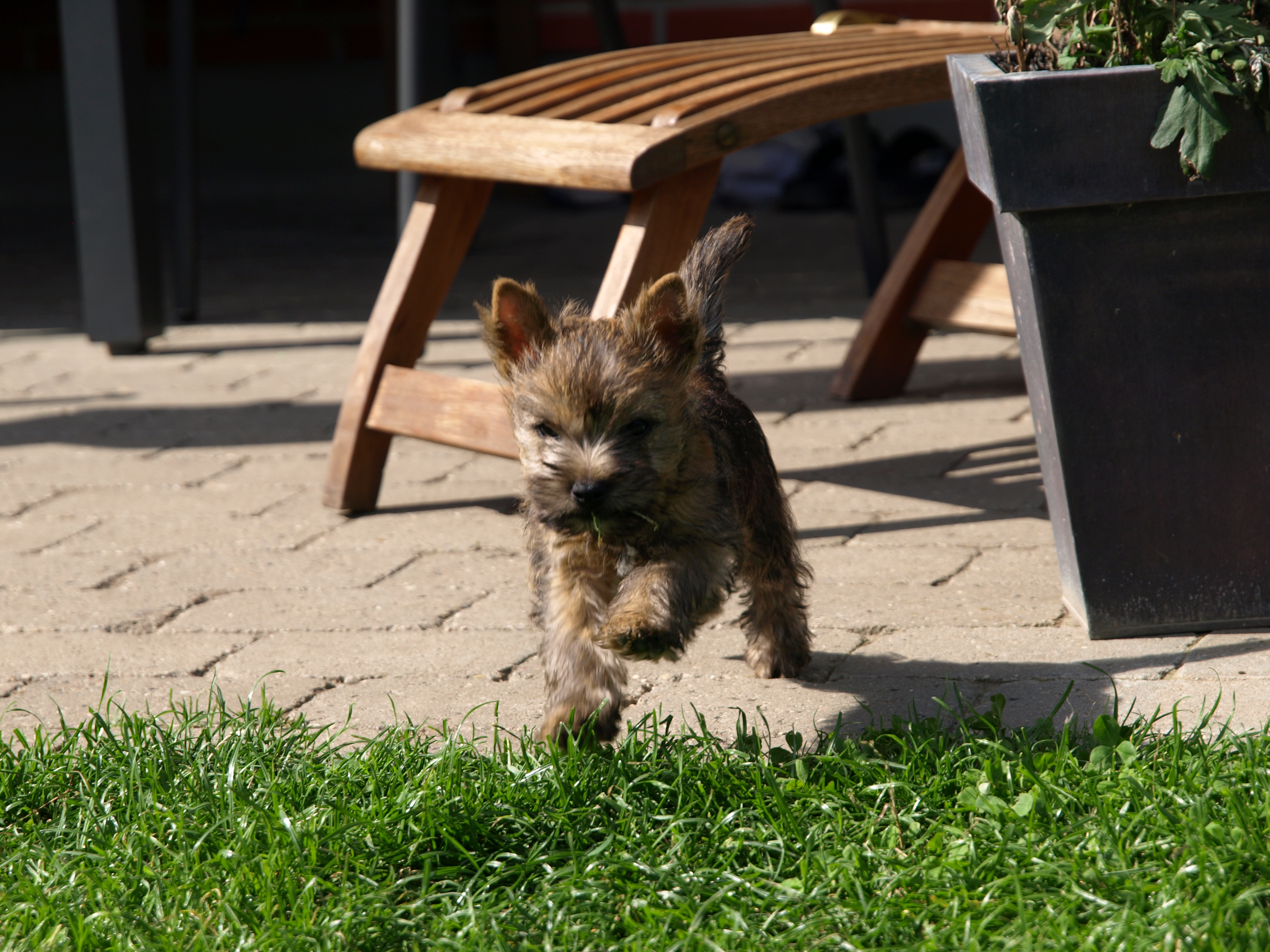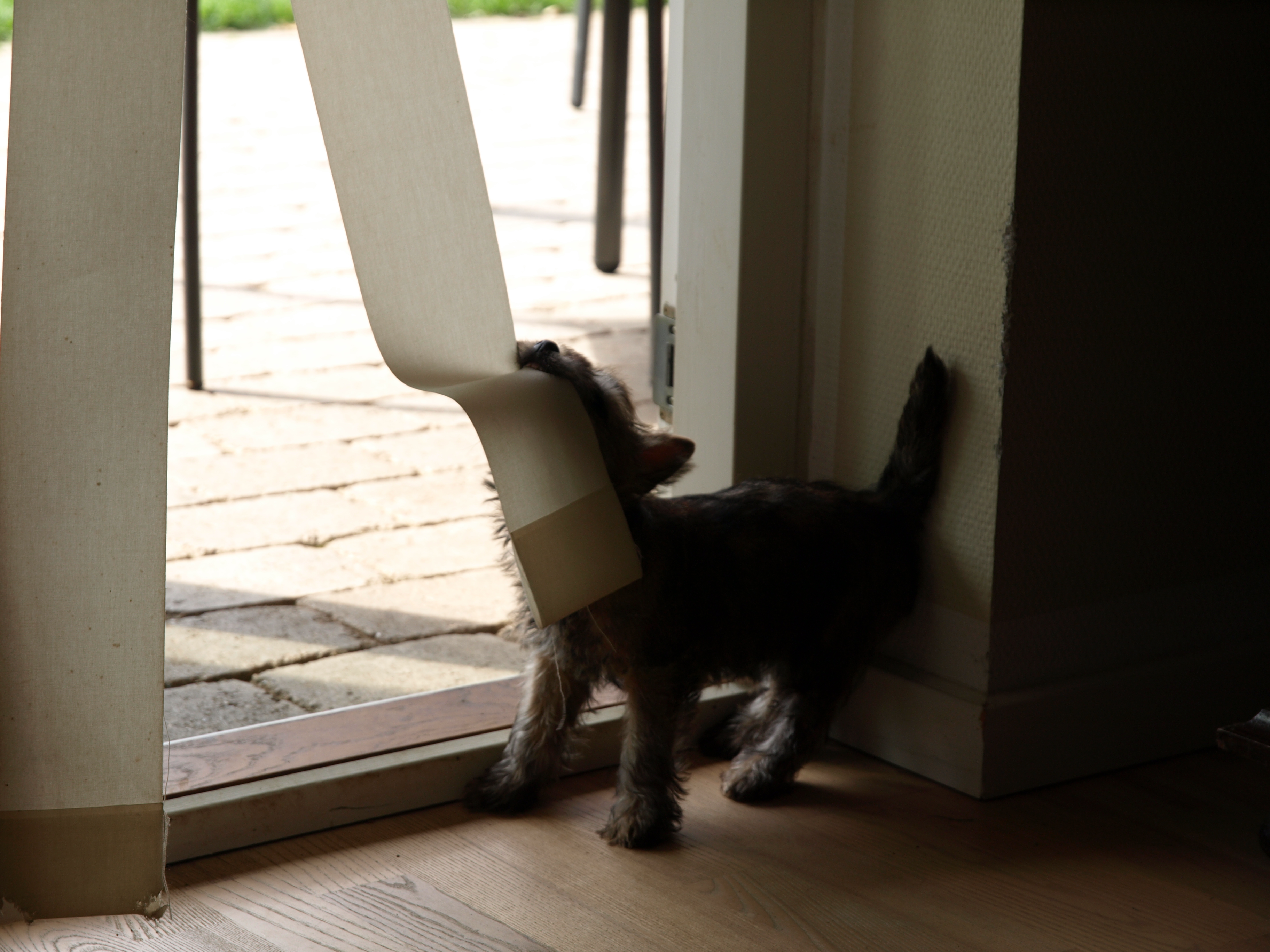 Herhjemme skal man lige holde lidt øje med Rocky hvis døren ud til haven er lukket i. Han er ikke helt sikker endnu, og man skal lige være opmærksom på om han lige er vågen, lige har tumlet eller går og lusker lidt rundt. Men sådan er det jo med hvalpe.