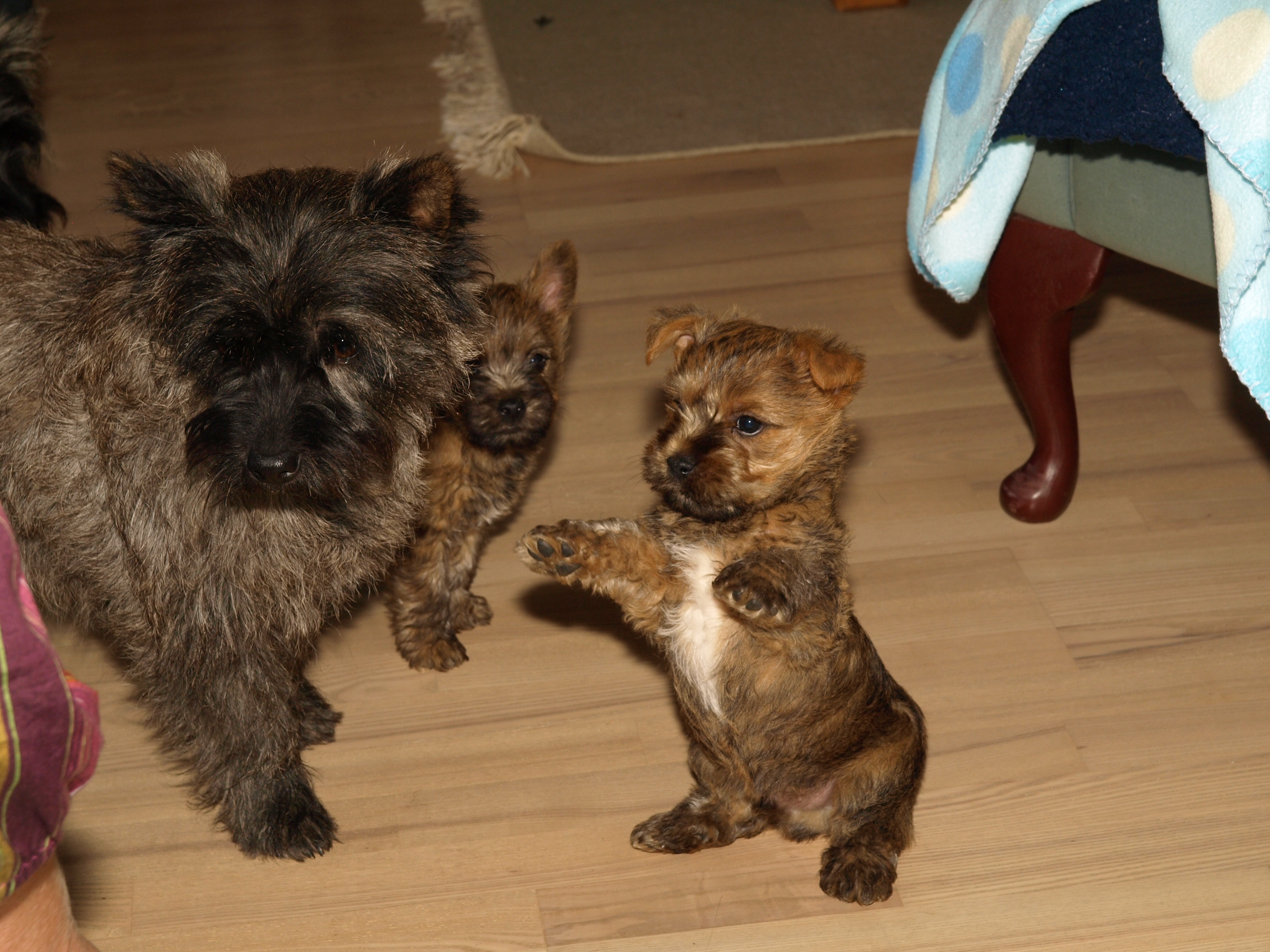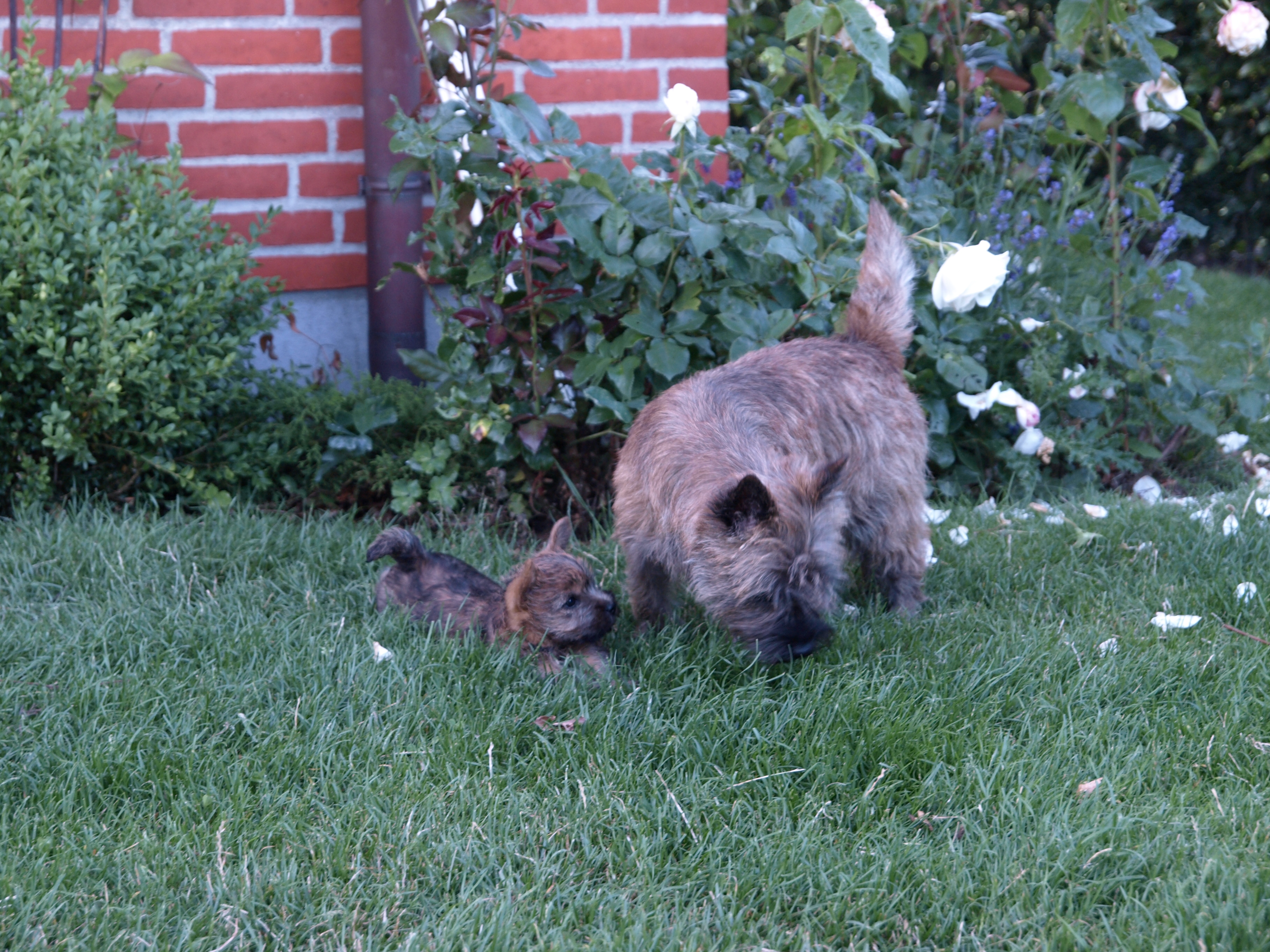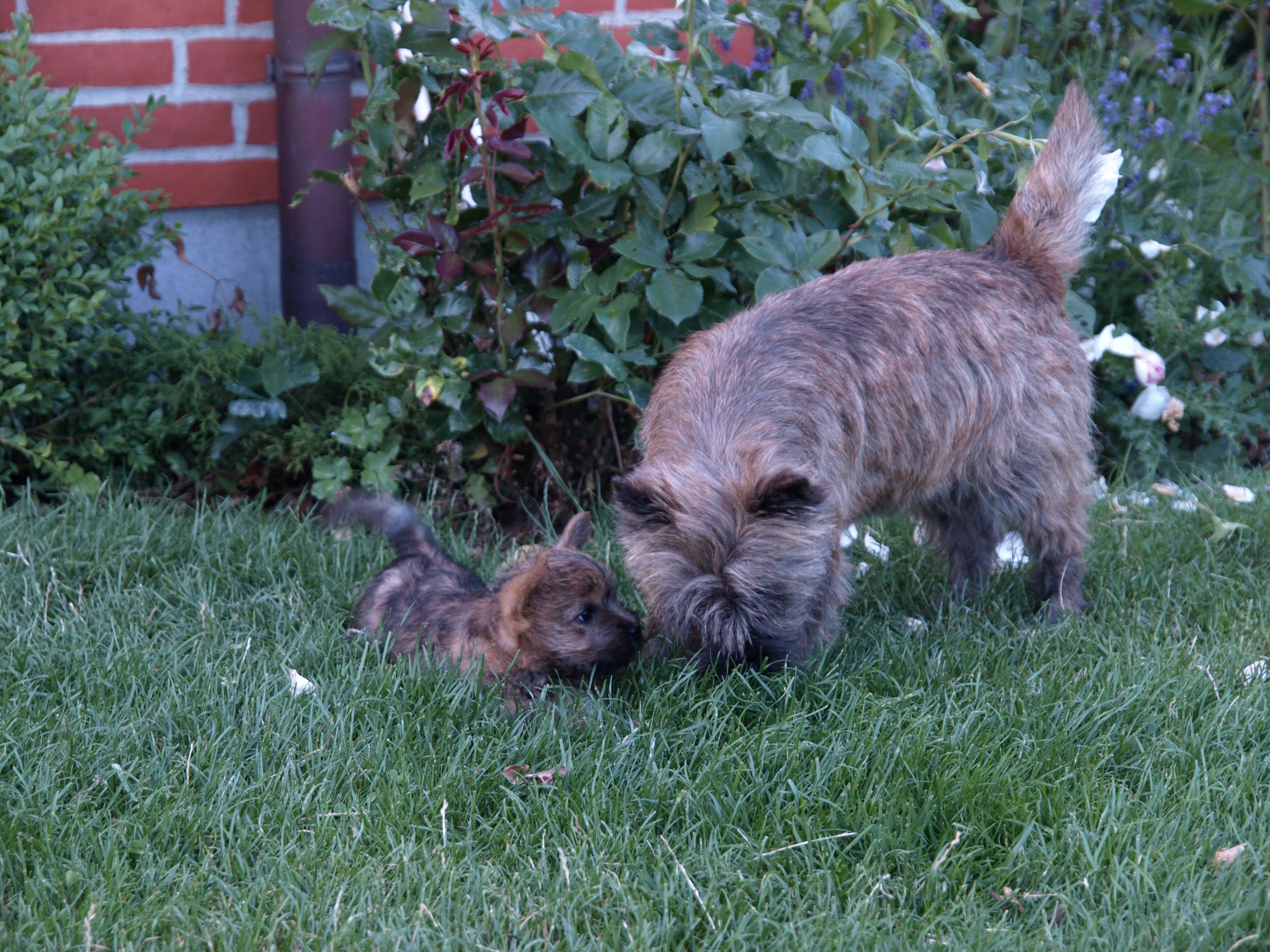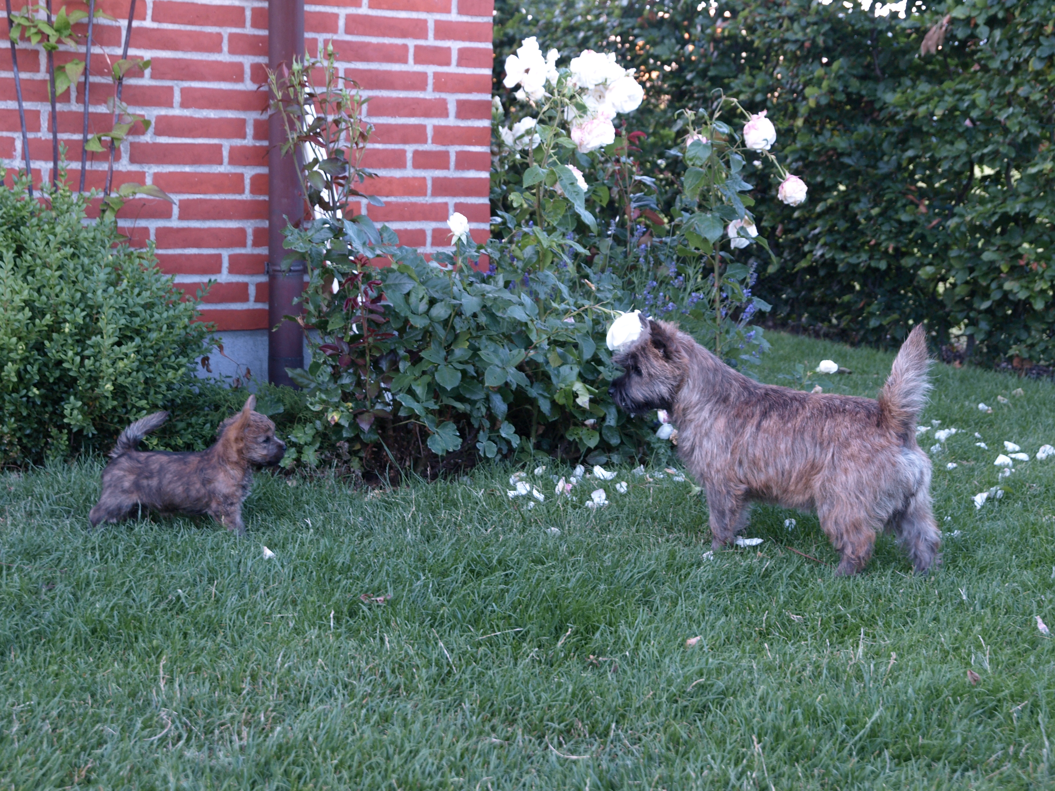 Noget af det, som vi var usikre på, var jo hvordan det ville gå med Dittie og Ronia mens vi havde hvalpene, men det er gået rigtigt fint. Ronia er bestemt ikke så fysisk medtaget som hun var sidst, hvor hun jo altså var rigtig tynd. Dittie har hjulpet til med opdragelsen og hun har været den fineste lege-tante.