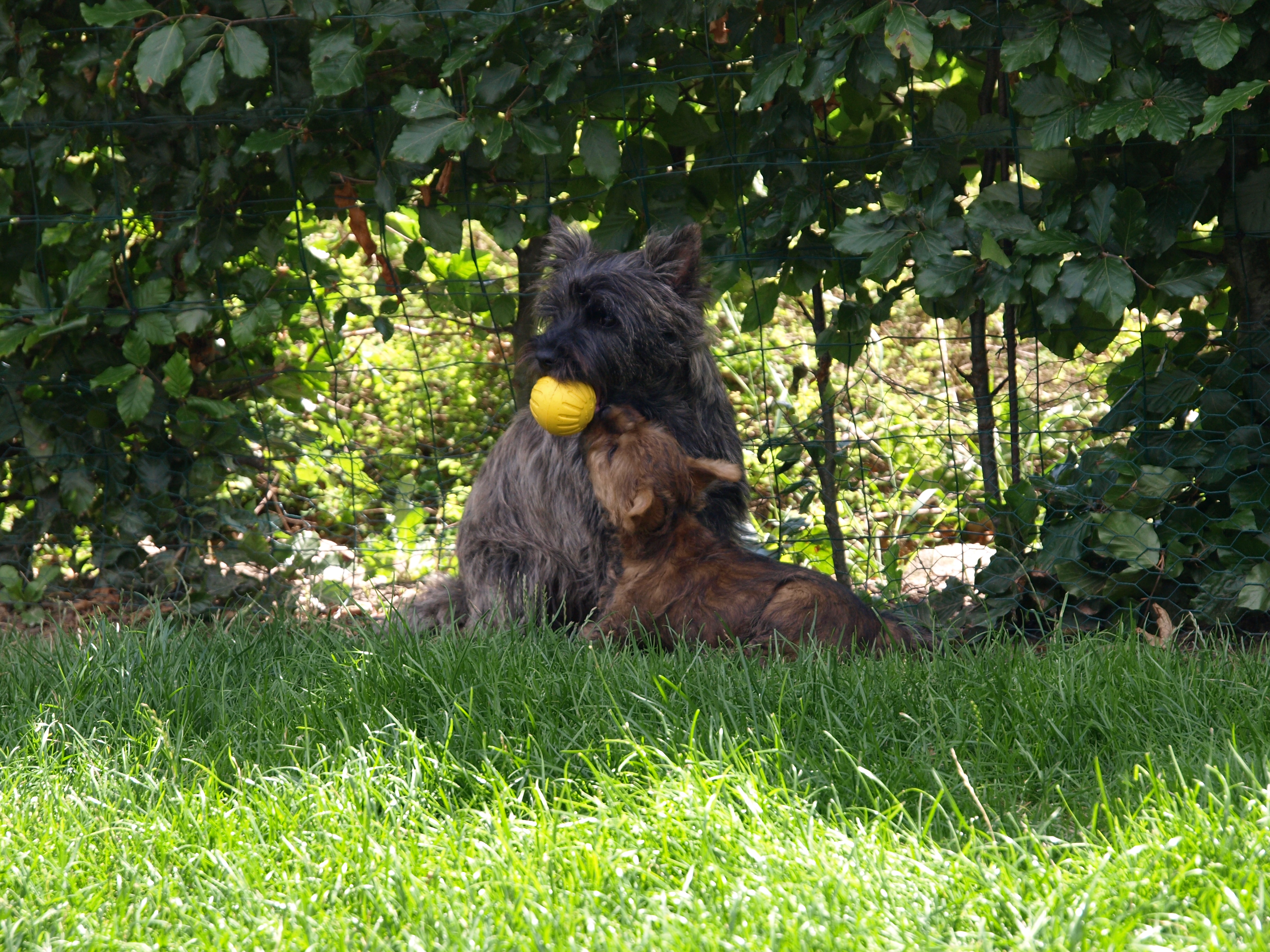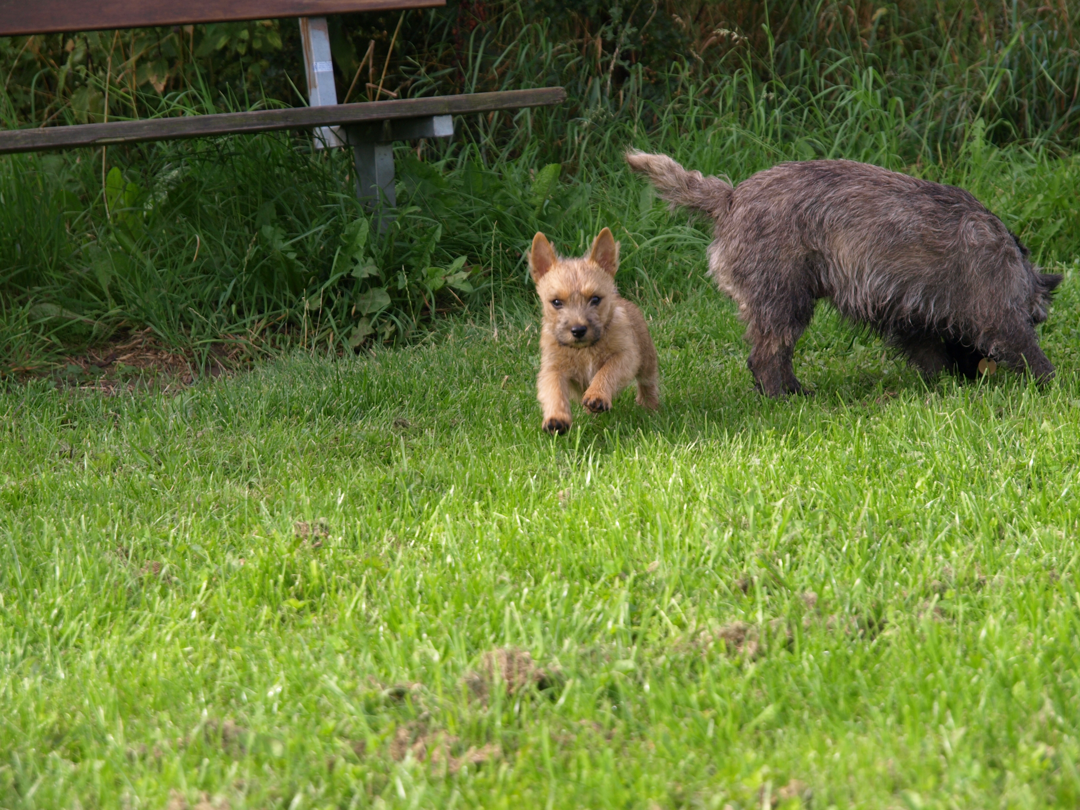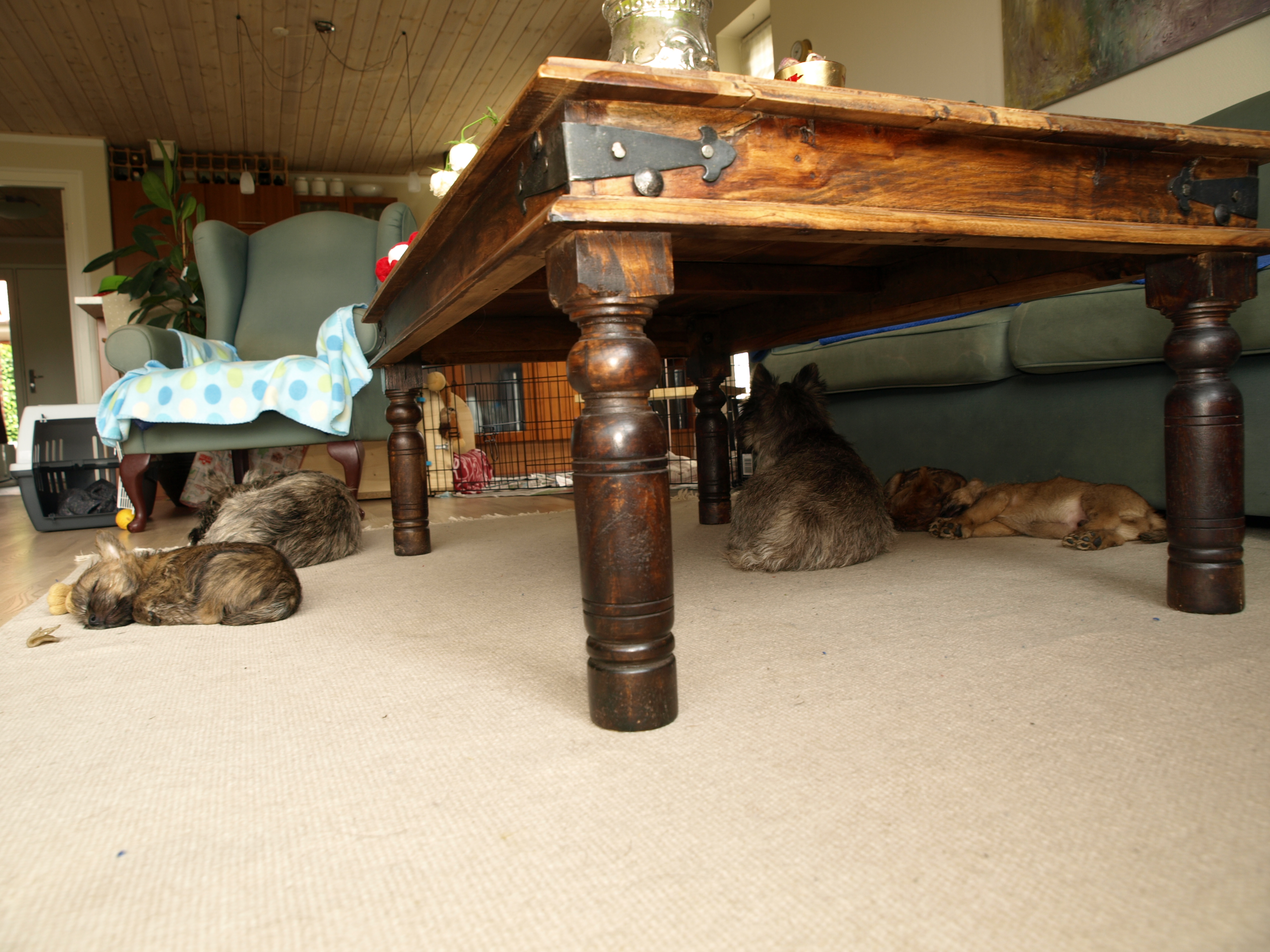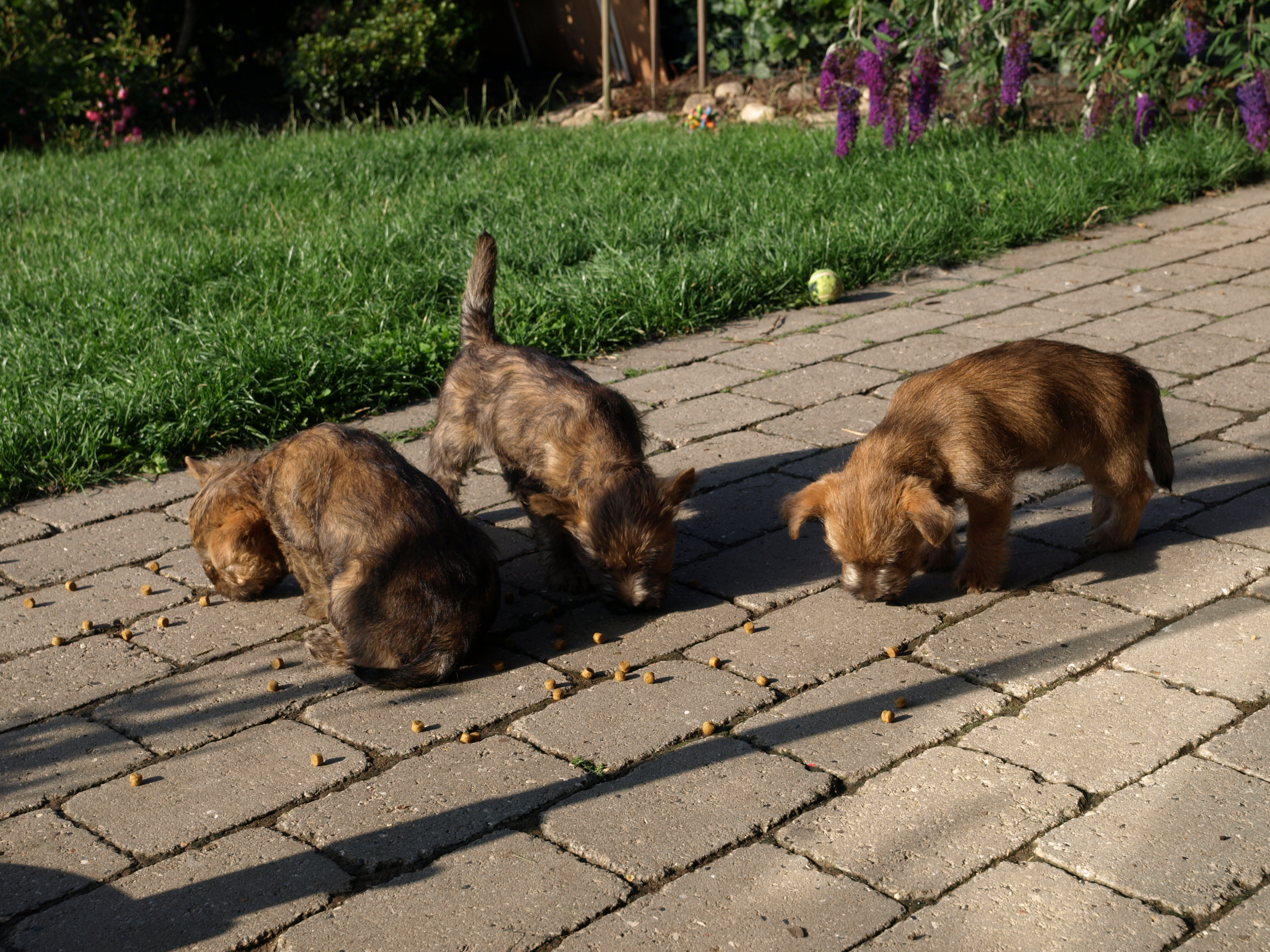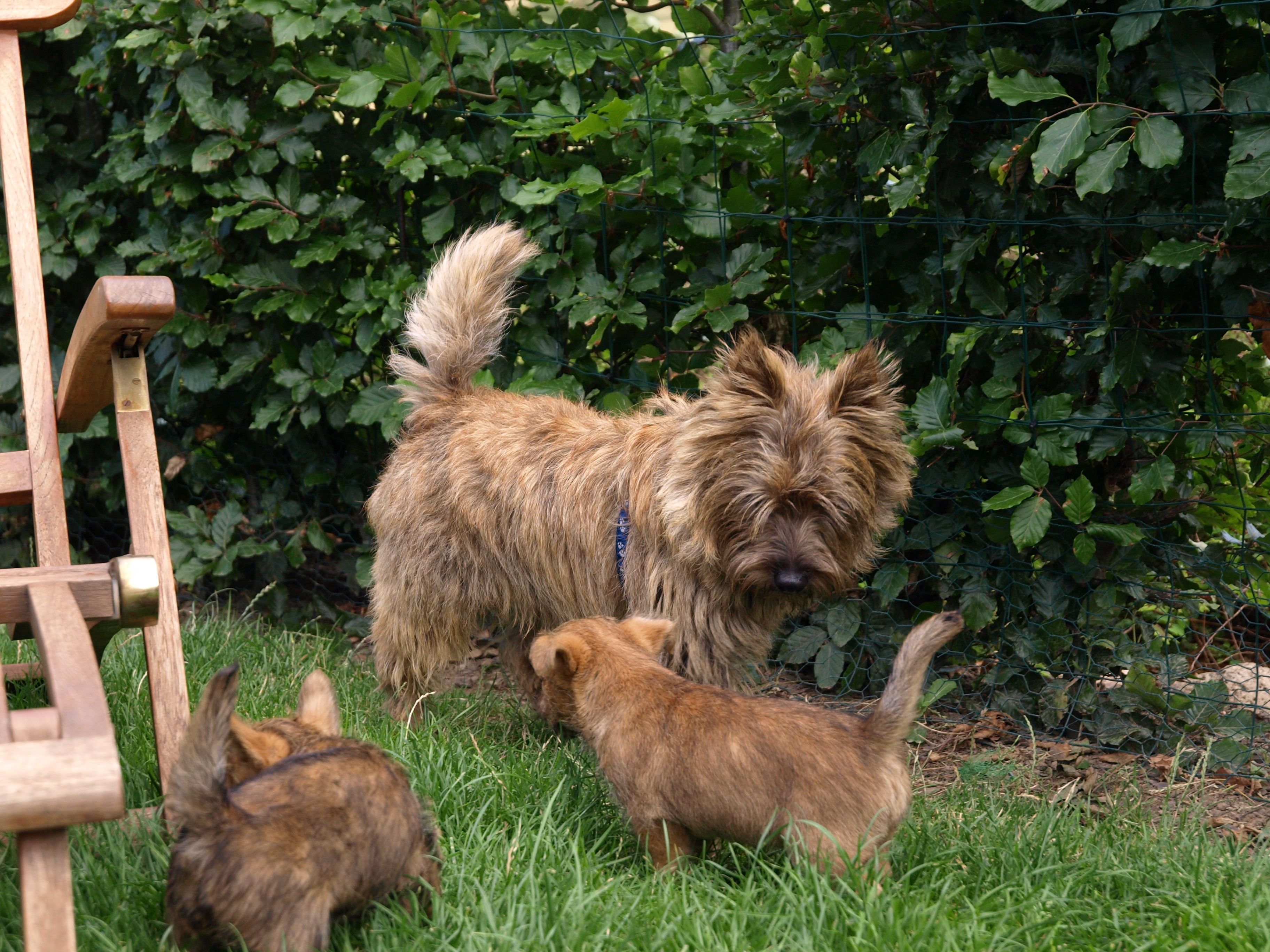 Noget af det, som vi var usikre på, var jo hvordan det ville gå med Dittie og Ronia mens vi havde hvalpene, men det er gået rigtigt fint. Ronia er bestemt ikke så fysisk medtaget som hun var sidst, hvor hun jo altså var rigtig tynd. Dittie har hjulpet til med opdragelsen og hun har været den fineste lege-tante.