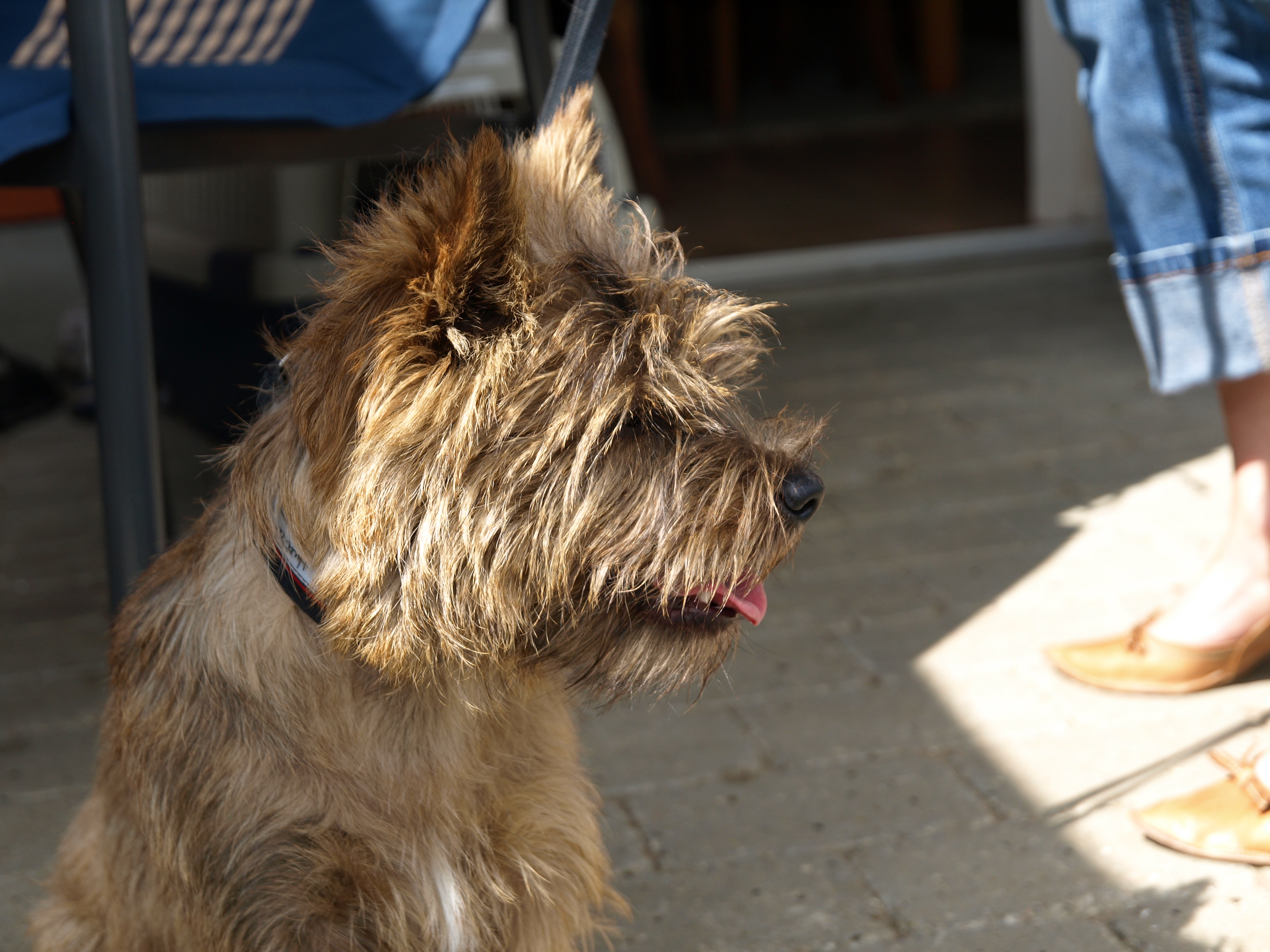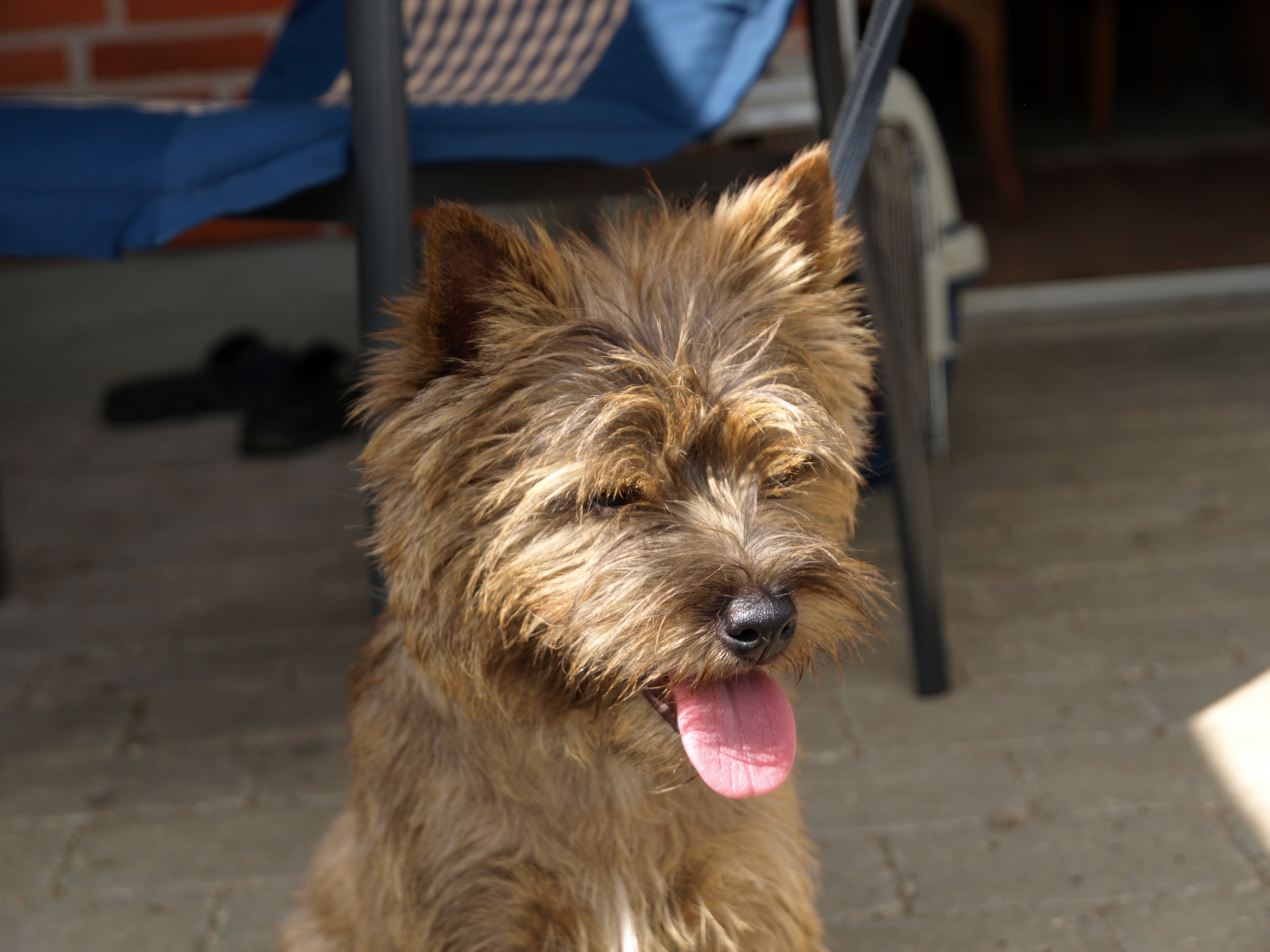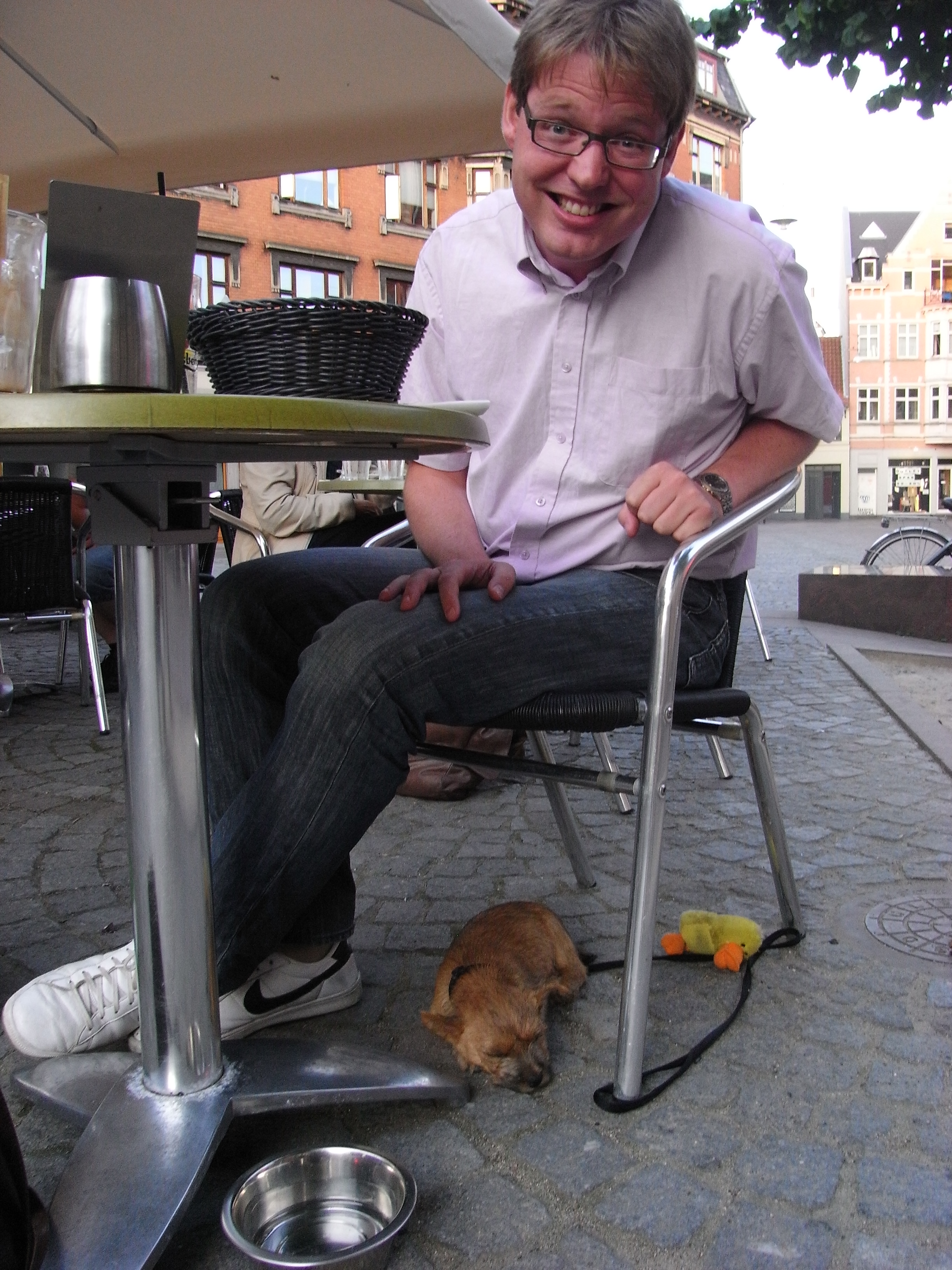 Rocky er så den sidste, tilbageværende røverbasse i det her kuld. Han flytter jo i næste uge, og han skal selvfølgeligt heller ikke snydes for oplevelser. I den sidste uges tid har han været med nede på vores lille hundeområde her i Holme, og hundeskovene ved Atletion og i Solbjerg, og så har han været med på Café i Århus, og han klarer alting så fint. Selv alene-hjemme træningen klare han glimrende.