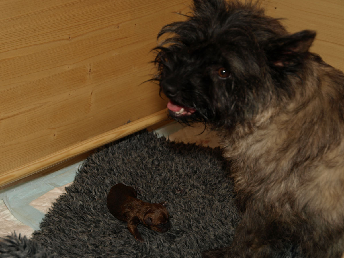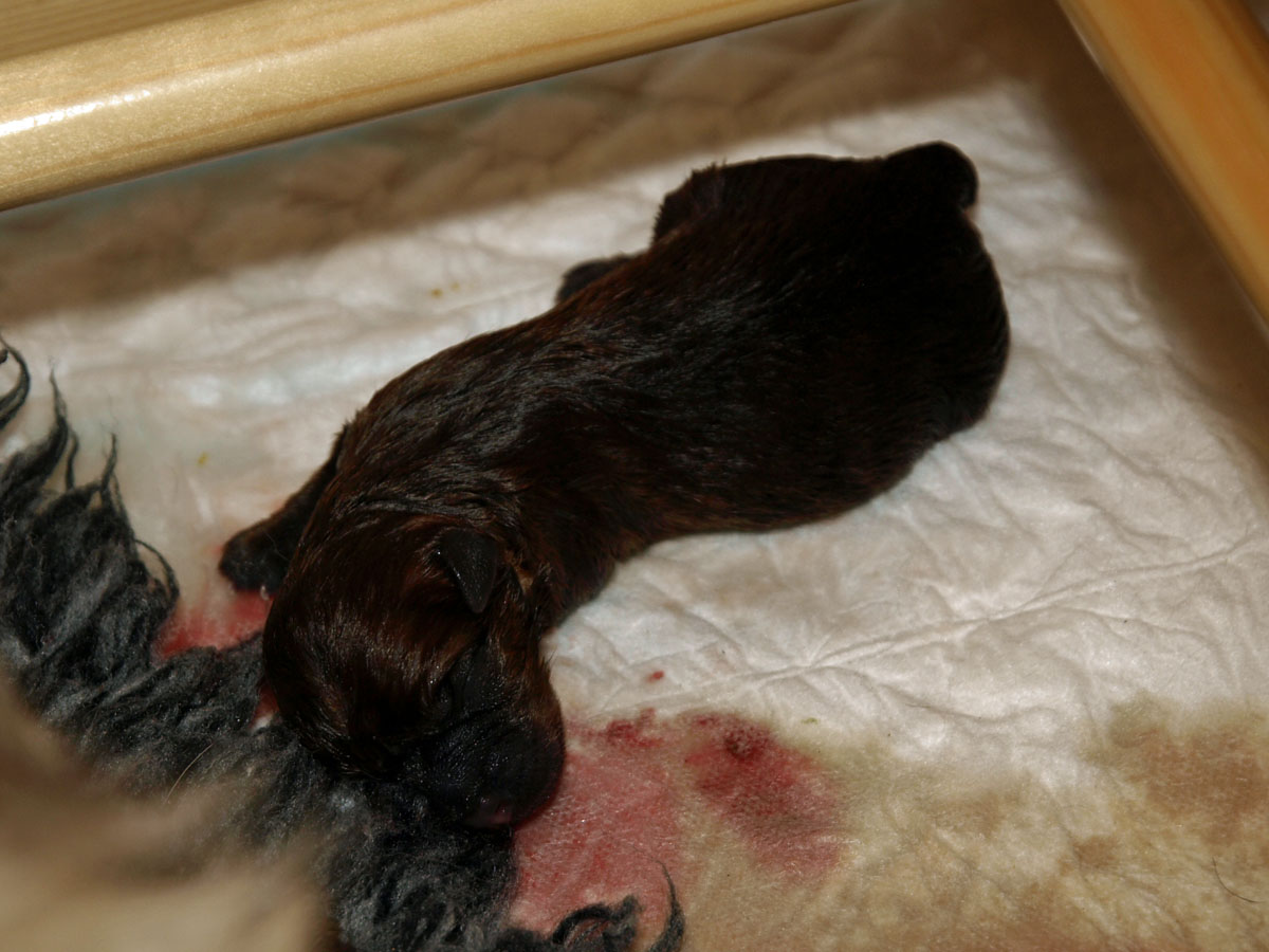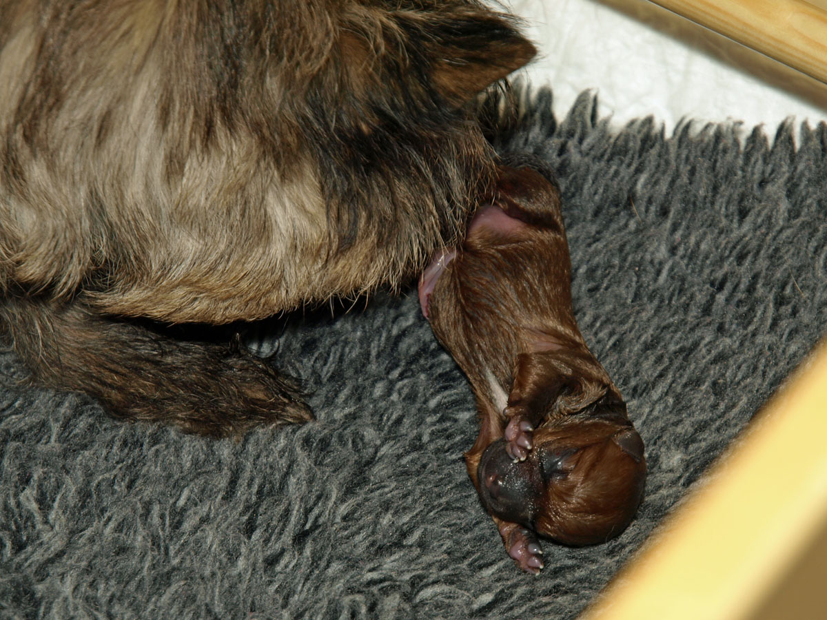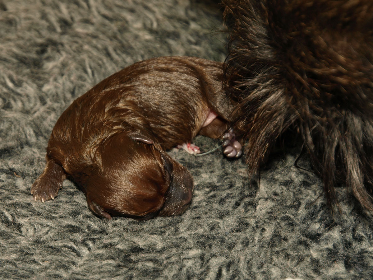 Første hvalp er en han, og blev født kl. 22:34 – vejede ved fødslen 203 g. Vi synes først at han var “brun” men vi må vist revurdere og sige lys rødbrun da han først var tør. Han har en hvid plet på brystet og en ret mørk hale, men ellers ingen kendetegn.