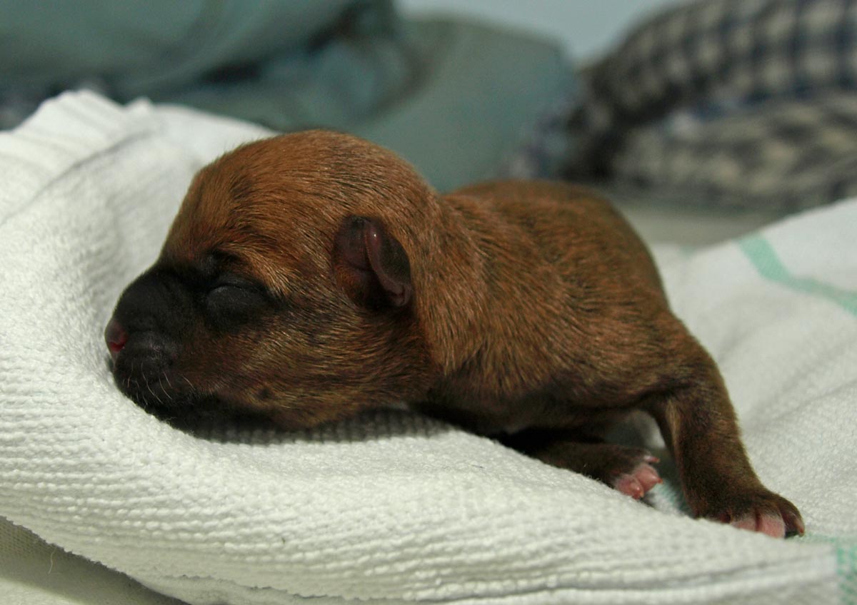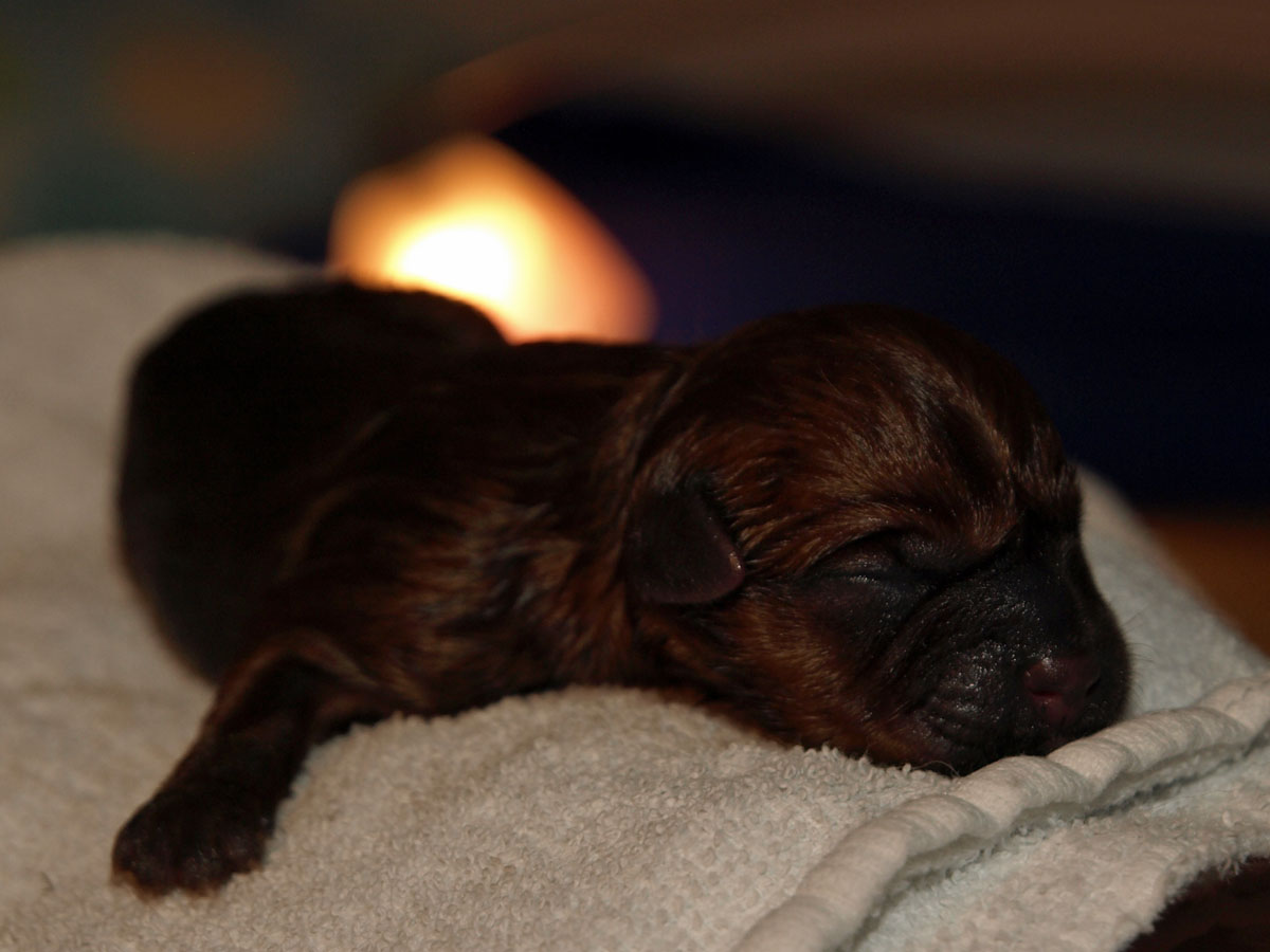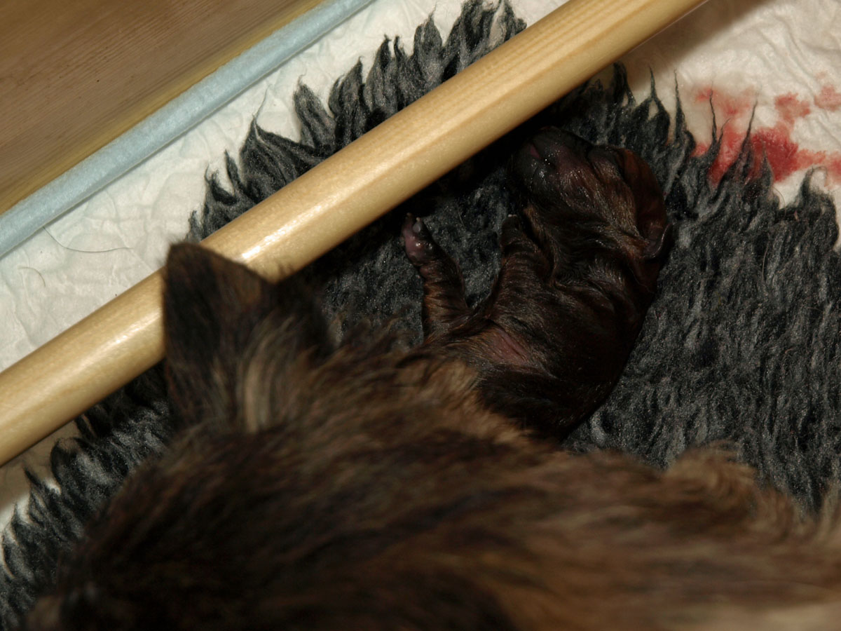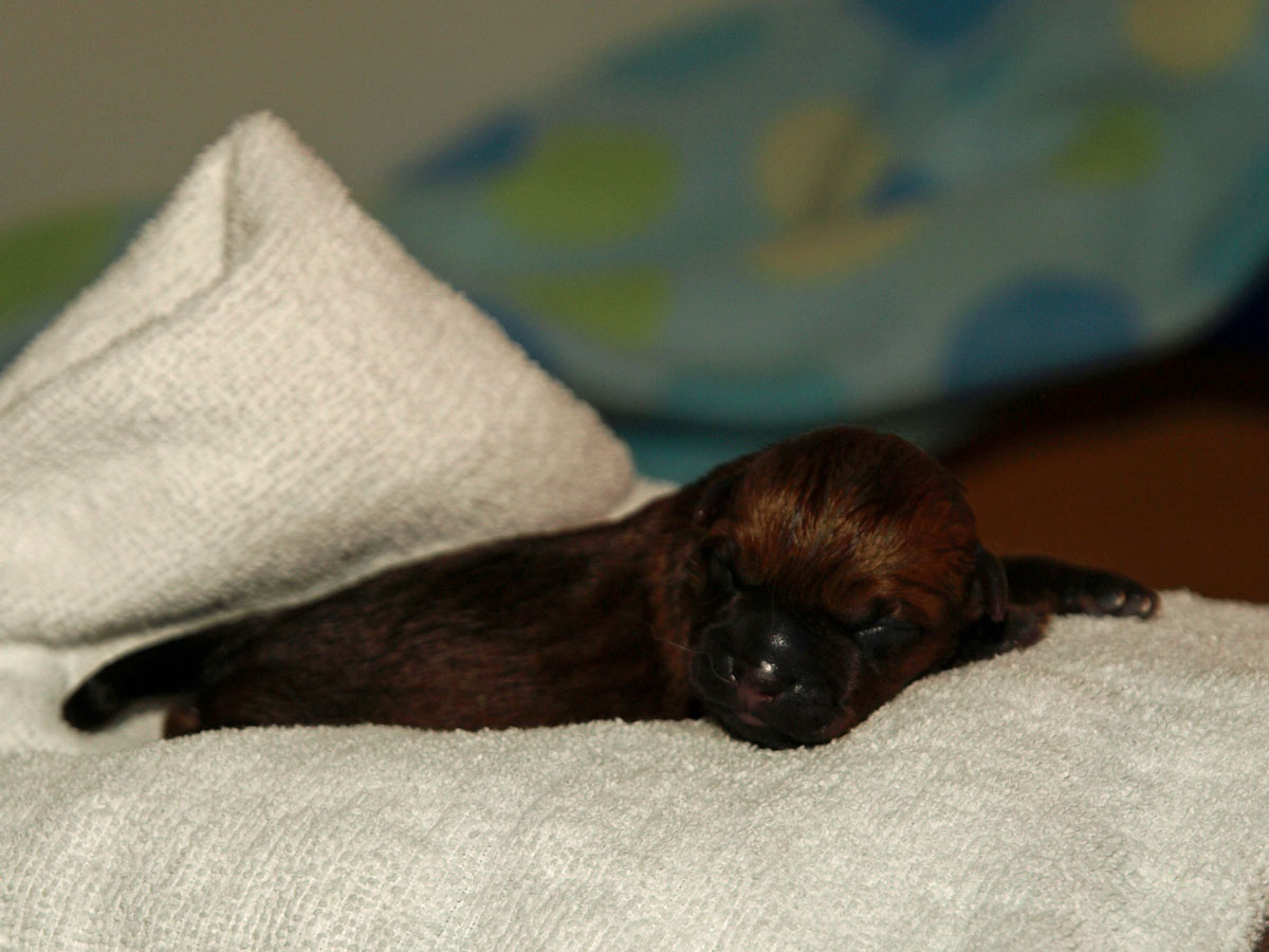 Første hvalp er en han, og blev født kl. 22:34 – vejede ved fødslen 203 g. Vi synes først at han var “brun” men vi må vist revurdere og sige lys rødbrun da han først var tør. Han har en hvid plet på brystet og en ret mørk hale, men ellers ingen kendetegn.