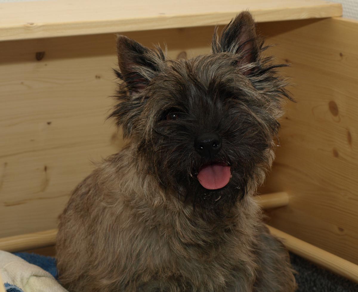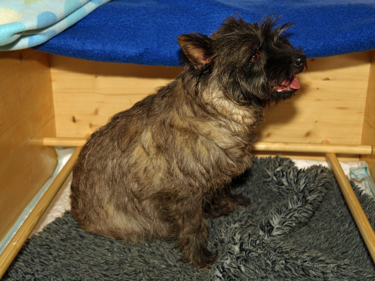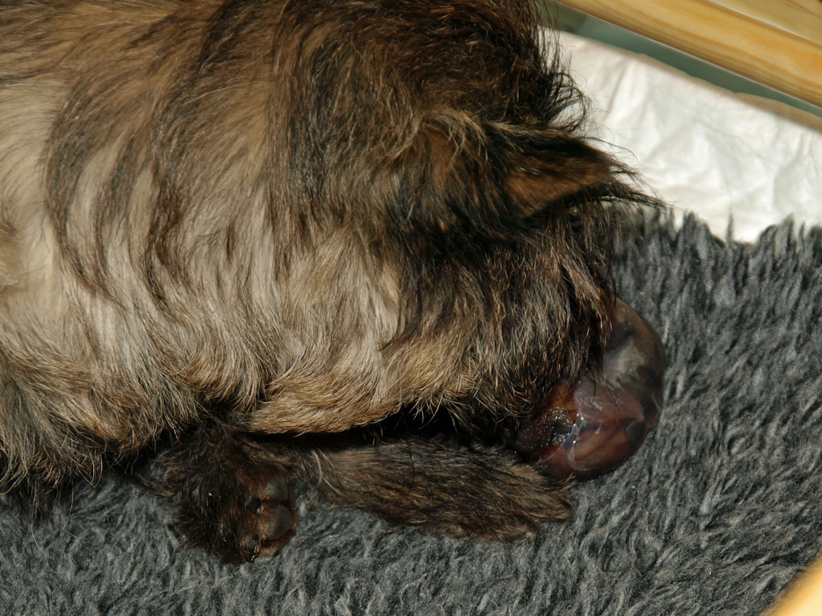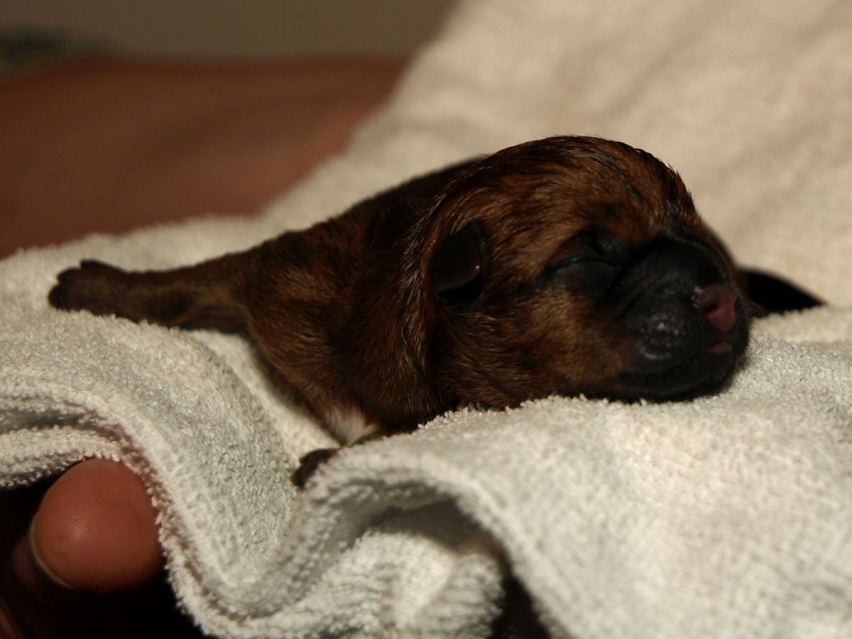 Første hvalp er en han, og blev født kl. 22:34 – vejede ved fødslen 203 g. Vi synes først at han var “brun” men vi må vist revurdere og sige lys rødbrun da han først var tør. Han har en hvid plet på brystet og en ret mørk hale, men ellers ingen kendetegn.