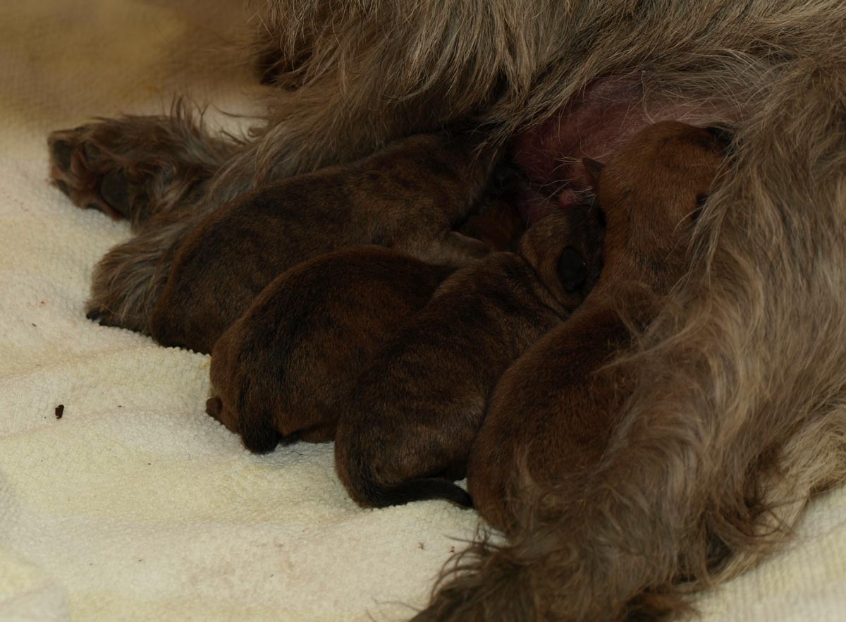 Begge hvalpe har lagt sig til patterne og tager for sig af Ronias mælk. Ronia stønner og puster og virker ikke til at være færdig endnu.