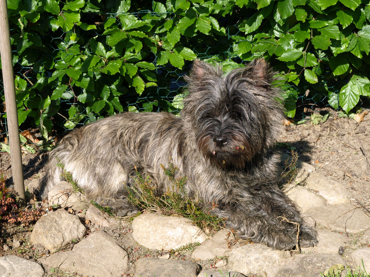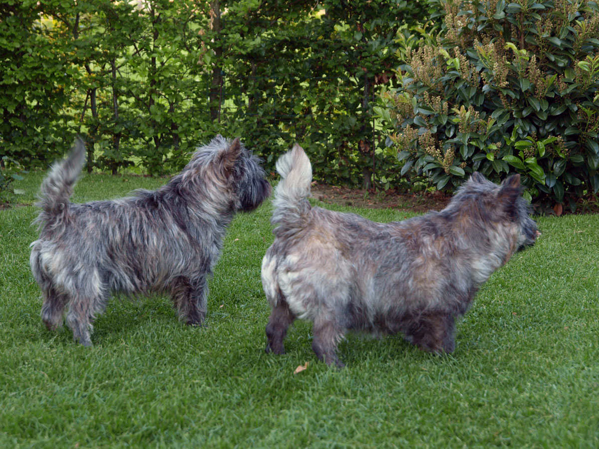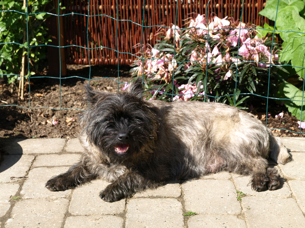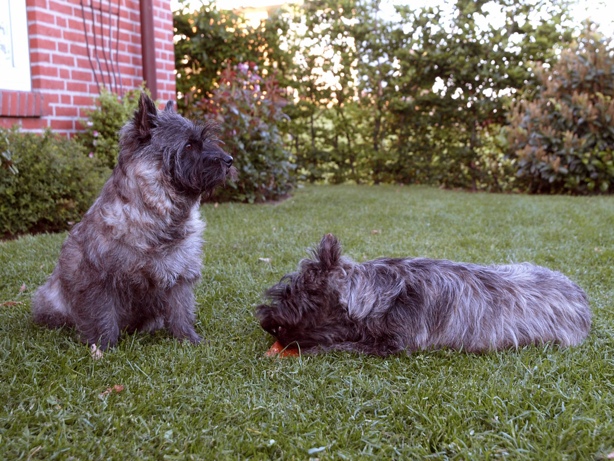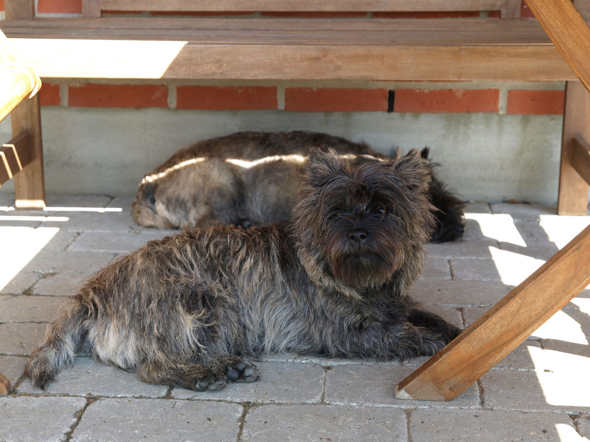 Hos os er havedøren er næsten altid åben når vejret er godt, og hundene elsker selvfølgeligt at være ude. Der er meget at spidse ører af, og de sender også gerne et bjæf ud til de, der går forbi.