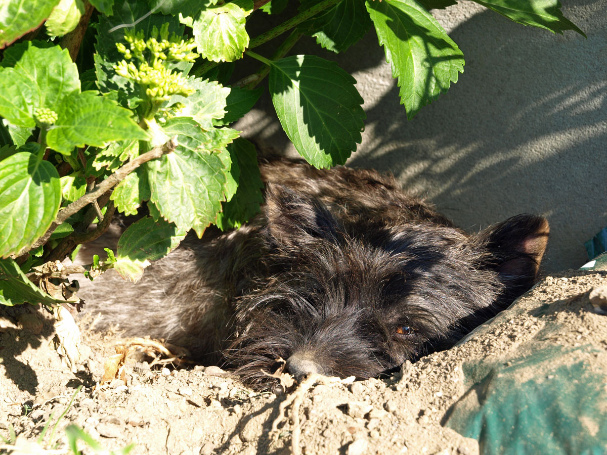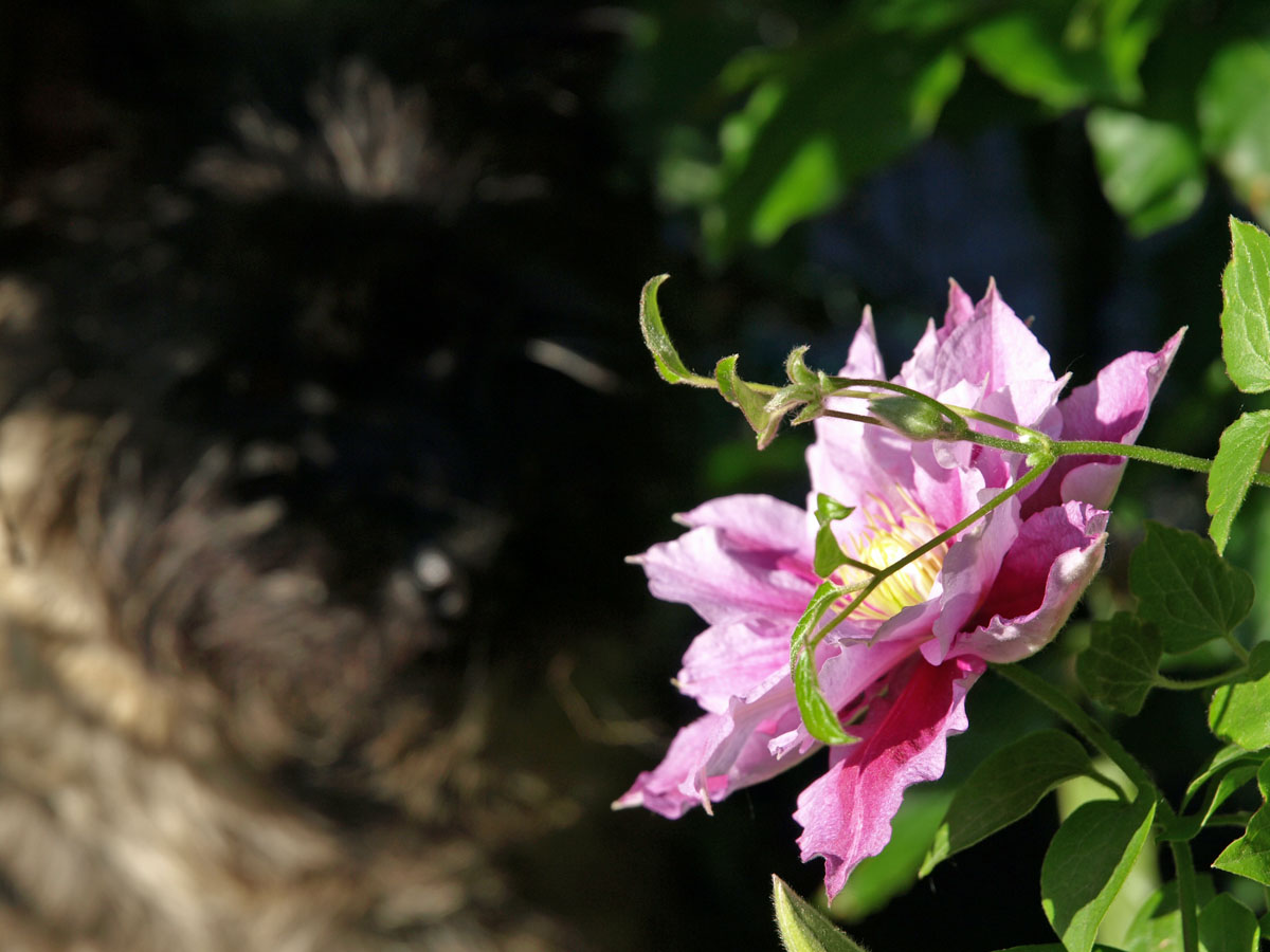 Ronia har fundet sig en skyggefuld plads under sommerfuglebusken, og Henning bruger morgenen på at kravle rundt, knipse med kameraet og forsøge at få både Klematis og Ronia i fokus.
