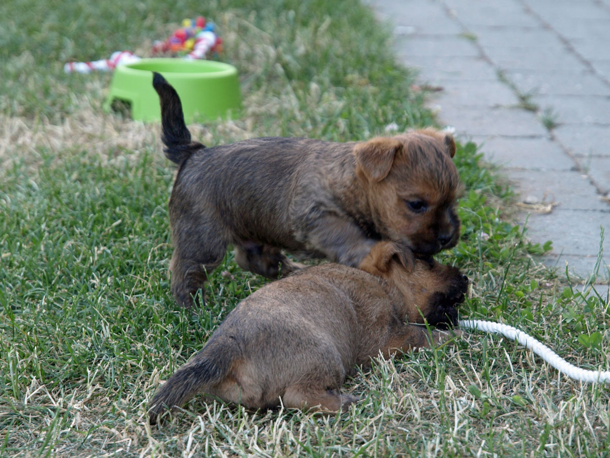 I går eftermiddags var de nede på det lokale, indhegnede hunde-område. Torsdag er “lille-hunde-dag” men der dukkede desværre kun 3 andre hunde op, og ingen af dem var specielt interesserede i de små krudtugler.