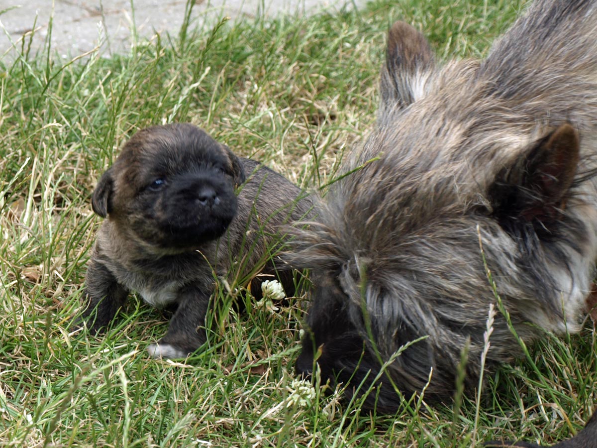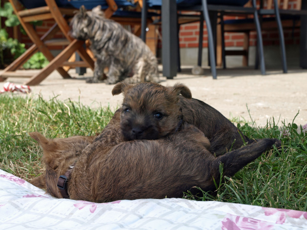 Her er lige et par hyggebilleder af hvalp nr. 2 i haven – og så har hvalp nr. 3 vist lige fået sneget sig med også. I går regnede det voldsomt og vi fik nogen ordentlige tordenbrag, og vi fik trænet hvalpene lidt til at de ikke behøver at være bange i tordenvejr.