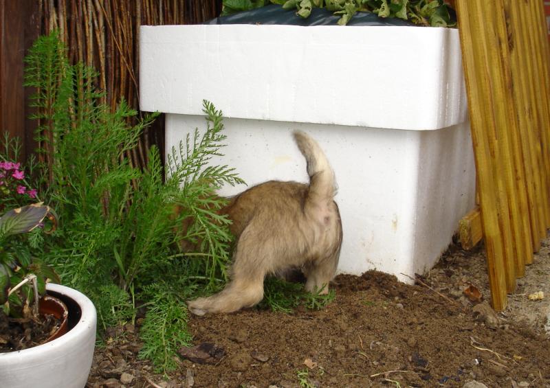 Cairns er naturlige, små gravemaskiner. Ronia har fundet et godt gravested under vandingskassen med tomater. Hun graver faktisk fra begge ender. Jeg er sikker på at hun har hørt om tunnelborer-maskinerne under Storebælt – men jeg er ikke helt sikker på at hun får lov til at grave hele tunnelen til ende — i hvert fald ikke så længe som der er tomater og vand i kassen. Billedet er fra søndag d. 24. juli. Søndag eftermiddag havde hun været på sin første springtur gennem hegnet. Bettinas mor, Bente, kaldte hende dog kvikt tilbage igen. Cairns er også jagthunde, og det skal de nok sørge for at minde os om.