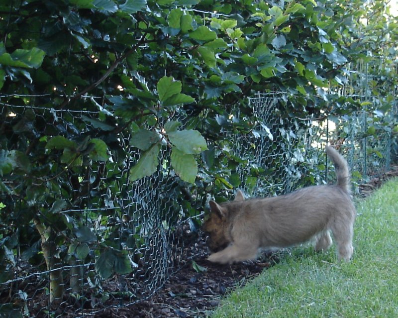 Ronia har også været med nede og handle (hun lå og sov pænt i kassen i bilen), vi har trænet tilkald og så har jeg hentet Ronia nede i det levende hegn og ovre hos naboen to gange. Suk! Hvis der skal sættes nyt hegn op på et tidspunkt, så køber vi eet med maskestørrelser, som passer bedre til Cairn-hvalpestørrelse.