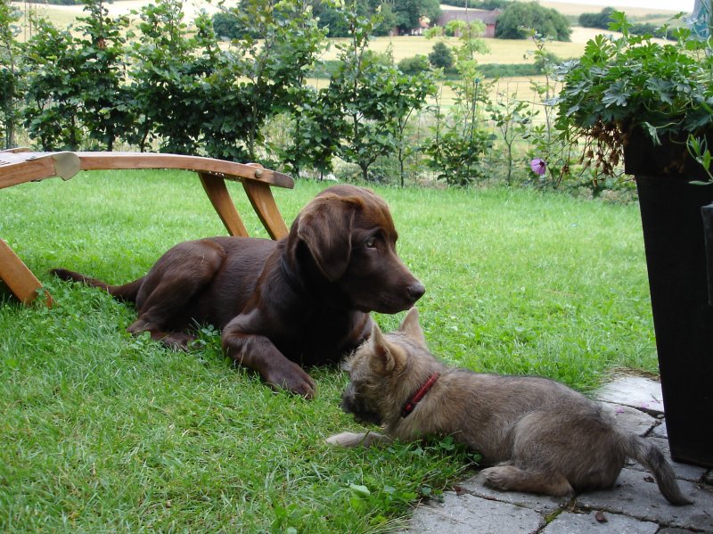 Fætter Harald, som er en brun labrador og er firmahund i Team TSC var på besøg i går. Han er kun 5 måneder, men med en vægt på omkring 20 kg mod Ronias 2 kg, og Haralds lidt hvalpede, store bevægelser, så var det ikke nogen helt “lige” legekammerat. Vi mennesker var lidt bange for at Harald skulle komme til at træde på Ronia. De to gik fint i spænd når de legede rolige lege som “godbidder under viskestykket”. Ud på aftenen sov de i sofaen sammen og legede også lidt tagfat rundt i stuen. Ronia udnyttede hjemmebanen og den terræn-fordel, som hun havde under sofaen og stolene (hvor Harald var for stor til at kunne møve sig ind). Og Ronia fik da vist lidt af sit knurrende, bidende, drillende terrier-temperament. Harald fik til gengæld vist at sådan nogen lab’s er lige så gode som dagen er lang. De to skal nok få glæde af hinanden når hun er vokset lidt mere.