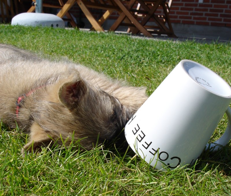 Vi har gået og ventet på at HTH kommer og sætter de skabe op, som de overraskede os (og tilsyneladende også sig selv) med at levere til os i mandags, så der har været god tid til at gå tur ned til kiosken og træne “stå bundet udenfor butikken” og hygge på plænen. Da Ronia for anden gang skulle finde sin bidering under kruset, så tog hun bare fat i hanken og vippede kruset – billedet er vist fra første forsøg, hvor hun brugte den mere konventionelle “skub med snuden til godbidden dukker op”-taktik.