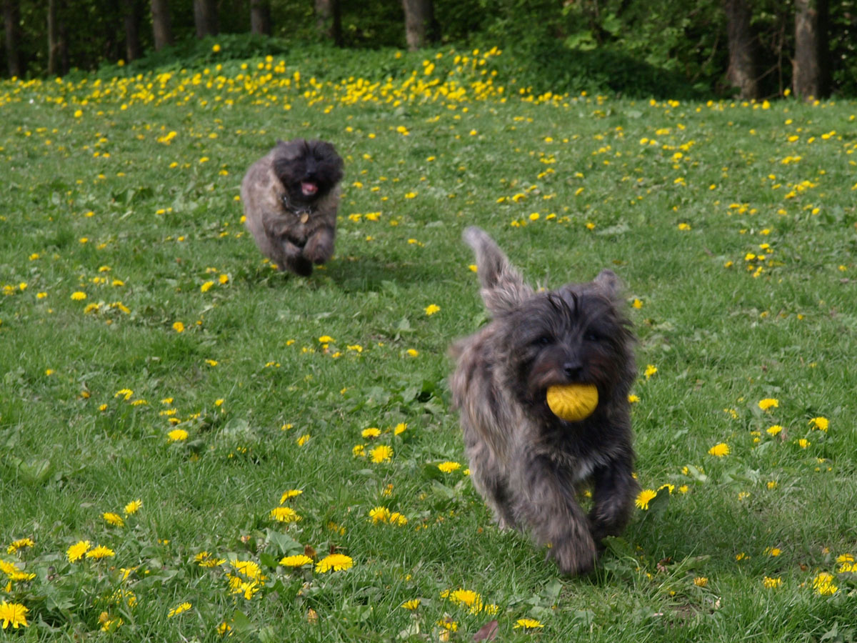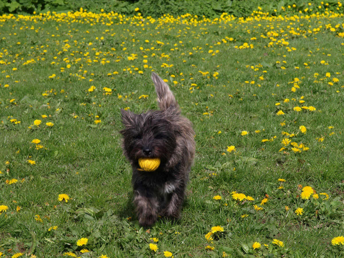 Hun er dog ikke så besværet, at hun ikke gider løbe efter bolde. Vi har knipset et par billeder med Hennings nye Olympus Zuiko 12-60 mm linse fra det lokale mælkebøtte-bestrøede hundeområde.