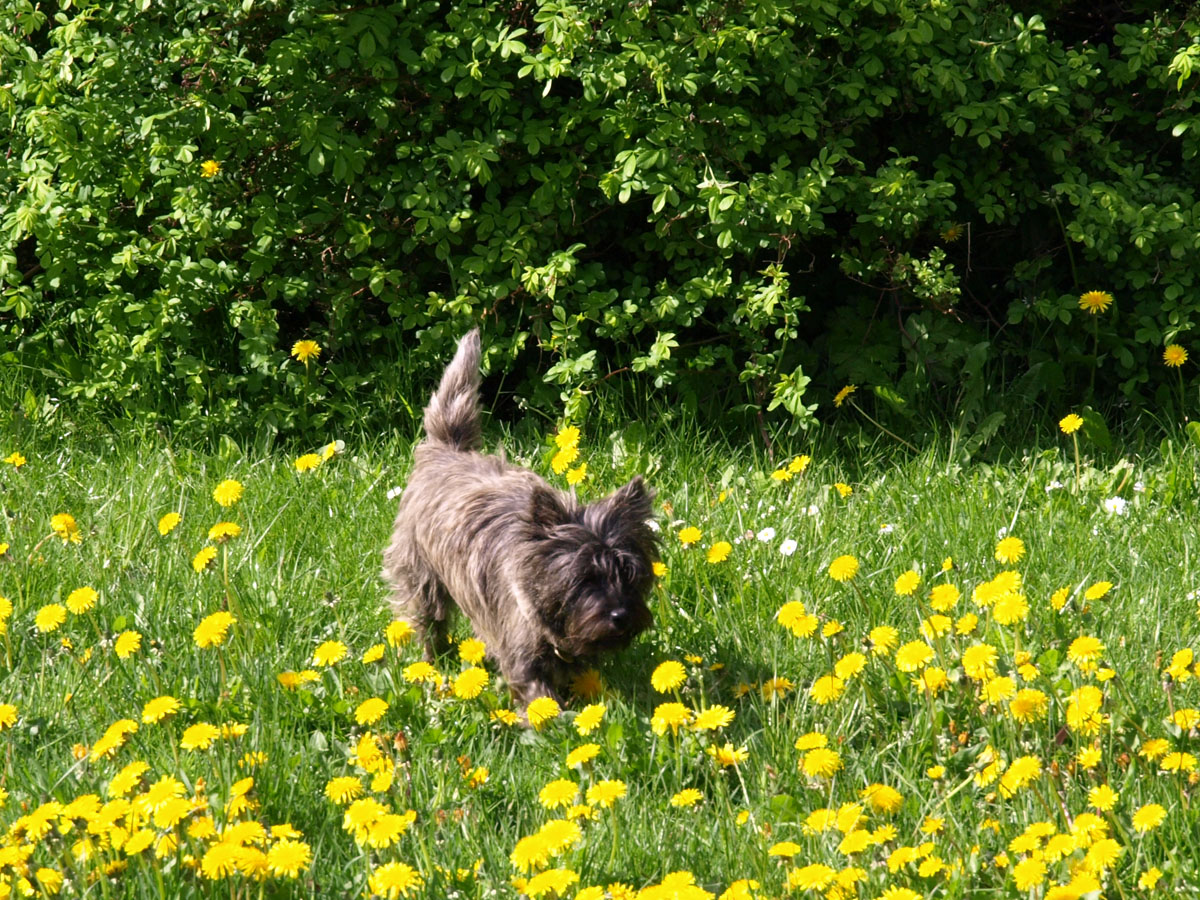 Selvfølgeligt har Ronia ikke noget imod sneen. Faktisk synes hun at det er rigtigt praktisk. For så er haven jo hævet nogle cm. i forhold til hegnet, og så har hun fundet ud af at hun godt kan springe over. Det er blevet til adskillige ture udenfor matriklen… Mens vi går og kalder på hende ude på de snedækkede marker, så spekulerer vi på om vi må ud og opgradere hele hegnet til et 90 cm hegn — eller vi kan nøjes med at forhøje de steder, hvor hun nemmest hopper over. Der er mange glæder, men også indimellem et par hovedbrud ved at være Cairn-ejer.