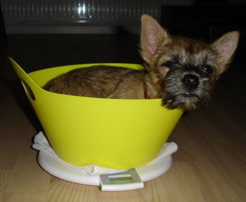 Hun vejede 3.2 kilo på dyrlægens vægt i torsdags, så Berits tommelfingerregel om 3.3 kg ved 3-måneders fødselsdagen bli’r da så rigeligt opfyldt.