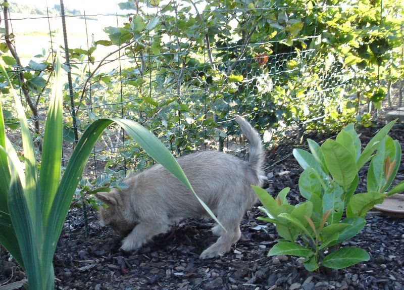 Efter hønsenet-opsætningen og Ronias eftertrykkelige kontrol, så har hun nu besluttet at haven er sikker nok til at hun kan begynde at grave hundekiks ned.